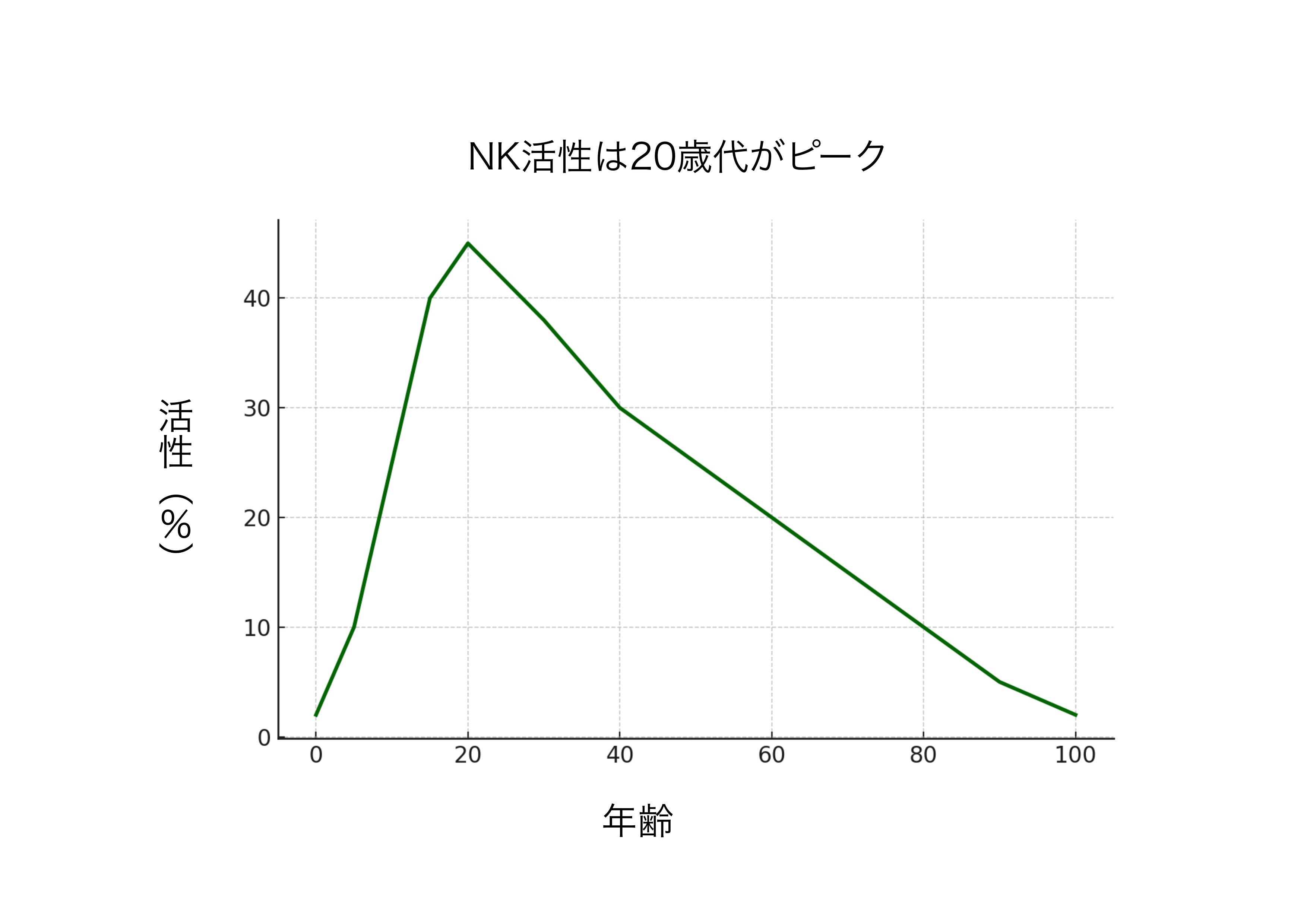 NK細胞の活性は40代以降では明らかにその機能が衰える傾向があります。ある研究では40代後半の人のNK活性を測定したところ、その値が12%しかなく、免疫年齢に換算するとなんと77歳相当という結果が出たとも言われています。こうした背景から生まれたのが、自分のNK細胞を採取・培養・活性化し、体に戻すことで免疫力を立て直す「NK細胞療法」です。