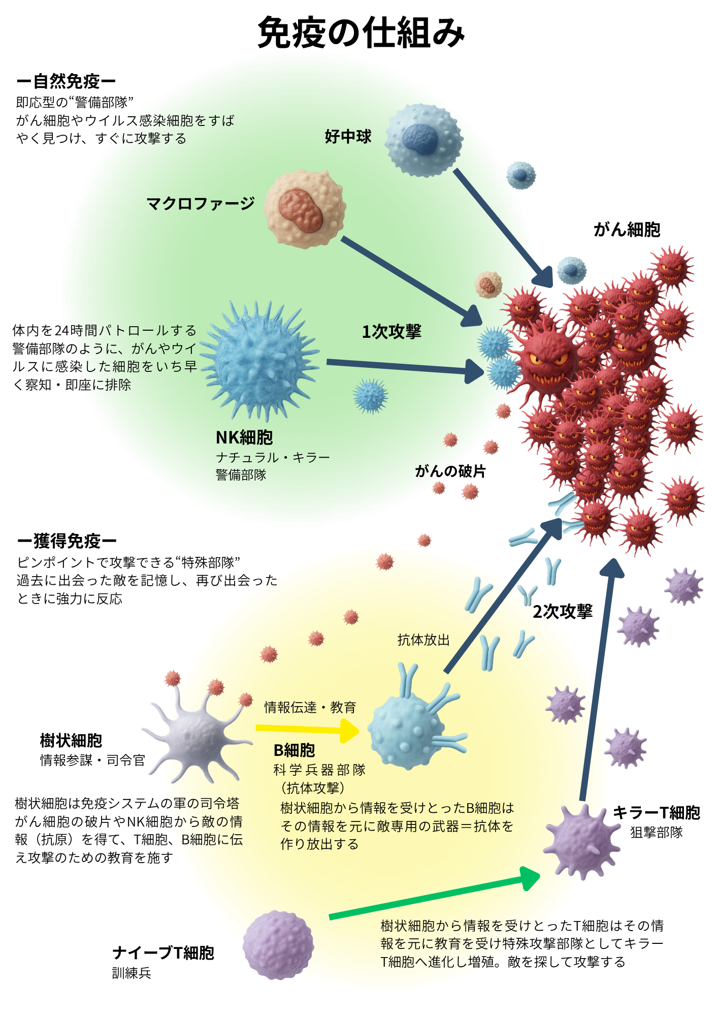 このように、私たちの体内では、「すぐ動く部隊」と「精密に動く部隊」が連携して敵に対応しているのです。